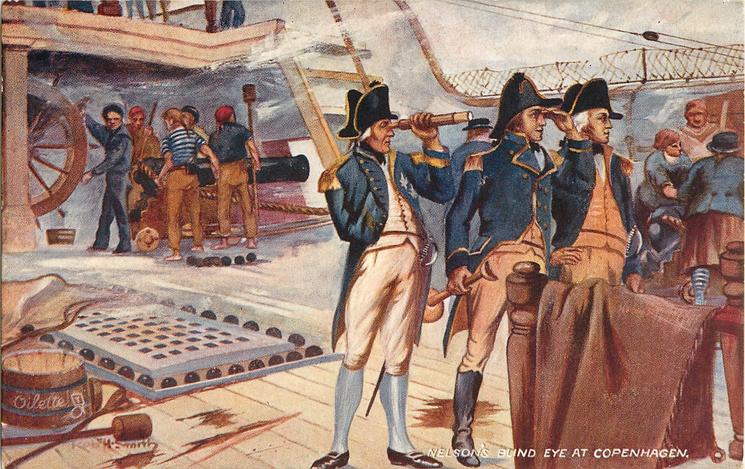 tuckdbpostcards.org shows a huge range of historic postcards, reflecting both the technology and attitudes of the time. Those used above are from a set of 6 oilettes “Eventful Nelson Incidents” from 1906. Information about the postcards is copyright hence individual references. The three used here are: https://images.tuckdb.org/postcards/images/000/120/906/extra_large/20110826153048.jpg Nelson’s Blind Eye at Copenhagen
