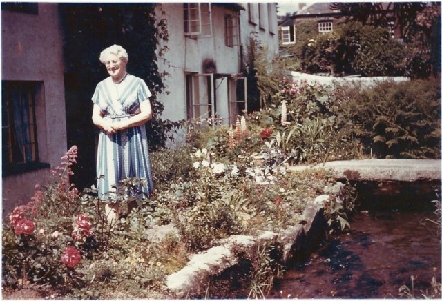 Sticklepath’s leat provided water power to run the mills. Primula House, seen here in the top right corner of the photograph marks the place where the leat moves from behind the houses to the front gardens. Shortly afterwards the water re-joins the Taw River at Sticklepath Bridge. Jessie Barron, nee Finch, is seen here next to the leat in her lovely sunny garden. It looks idyllic. However, several tragedies are associated with this waterway.