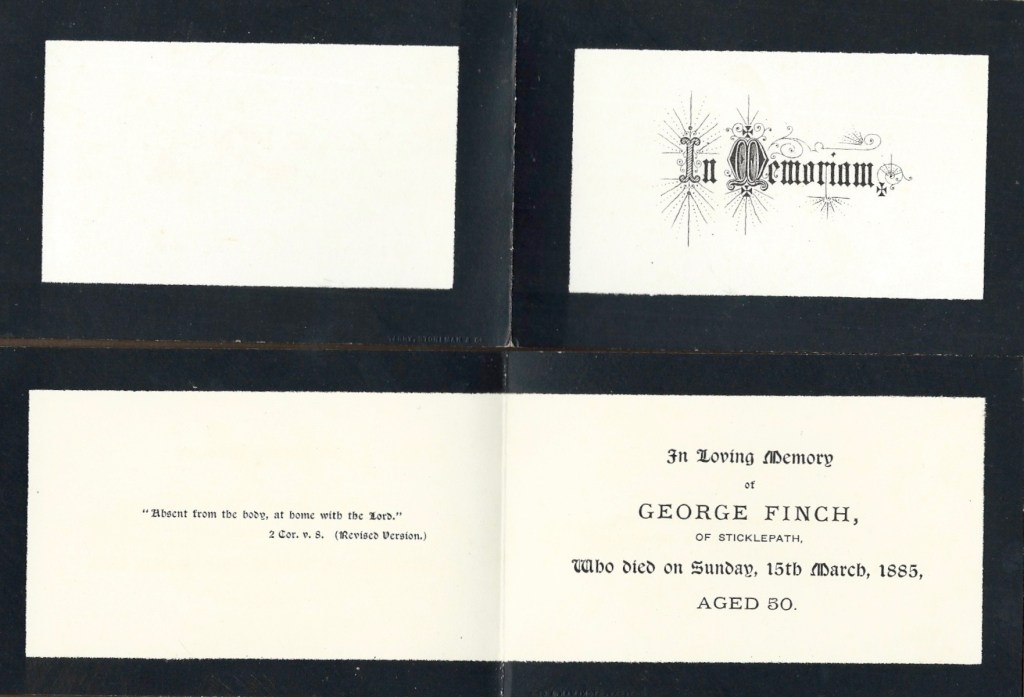 George Finch, aged only 50, took ill fairly suddenly and died. The family understood he had toothache, the doctor prescribed opium, and he died seemingly of an overdose. The death certificate tells a different story, which need not concern us here. Even today, with all our scientific advances there are often inconsistencies and unanswered questions surrounding a death. Were people more accepting in the past? I wonder.