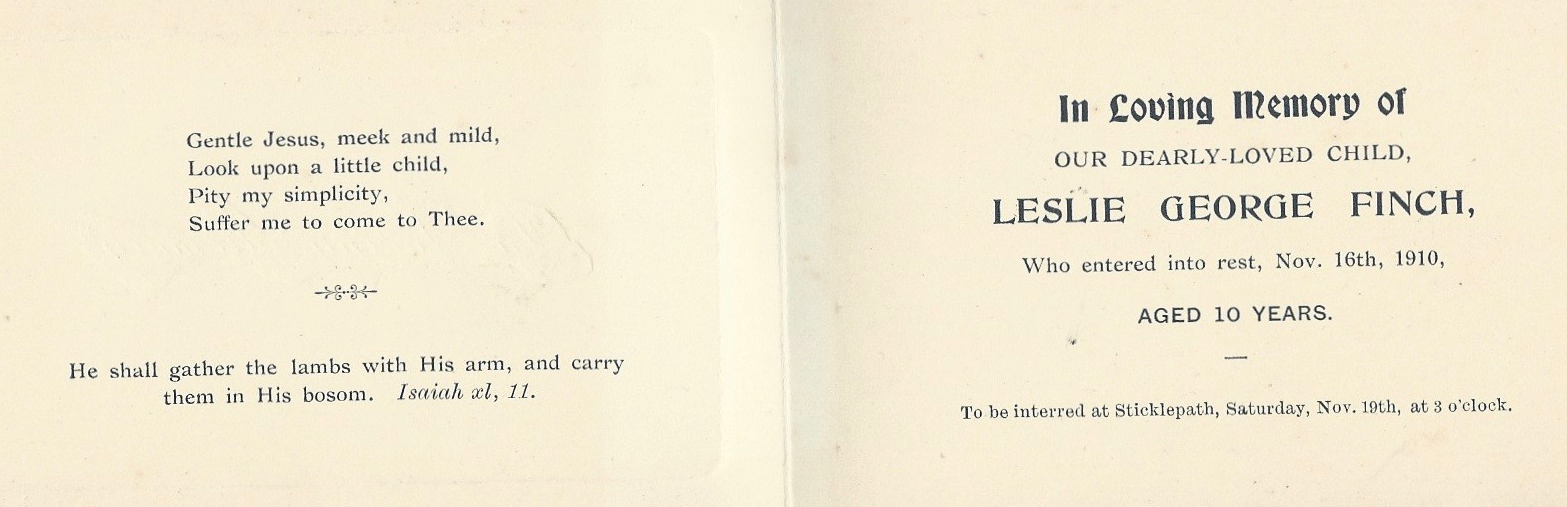Leslie had been poorly for some time and his death certificate shows he died of consumption, which is TB or tuberculosis. Three generations of the family at least were affected by this disease. This is an image from the memorial card: