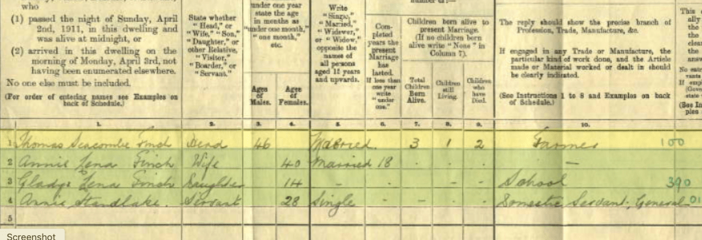 The 1911 census states the facts as cold statistics. Three children born alive, two who have died. One still living. Childhood deaths were still fairly common. Daughter Gladys aged 14 continues at school. Annie Standlake domestic servant has been with the family for over 10 years.
