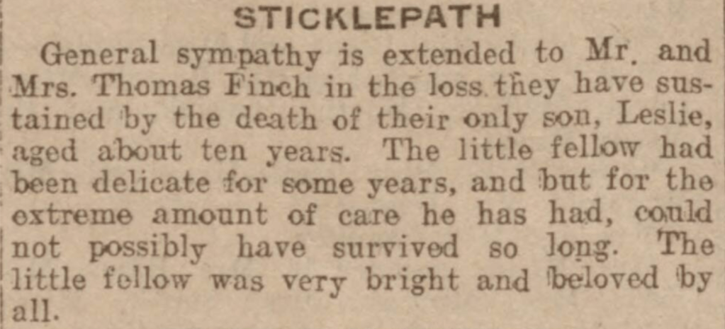 Our saga of Thomas Finch and family continues. Last week we heard about the Coroner’s case when Victor Thomas Finch drowned aged 22 months. Happier times followed when Gladys Lena was born in 1897 and then Leslie George in 1900.