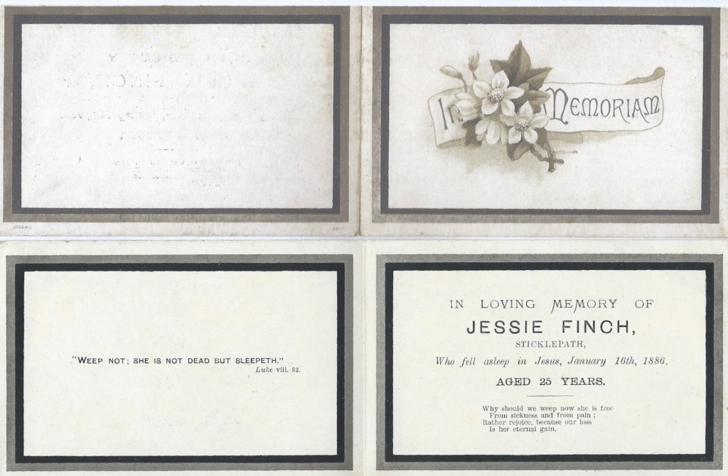 Sadly Jessie died of consumption (TB) in 1886 aged 25 when her niece and namesake little Jessie was almost 1 year old. For some reason two different memorial cards were produced: