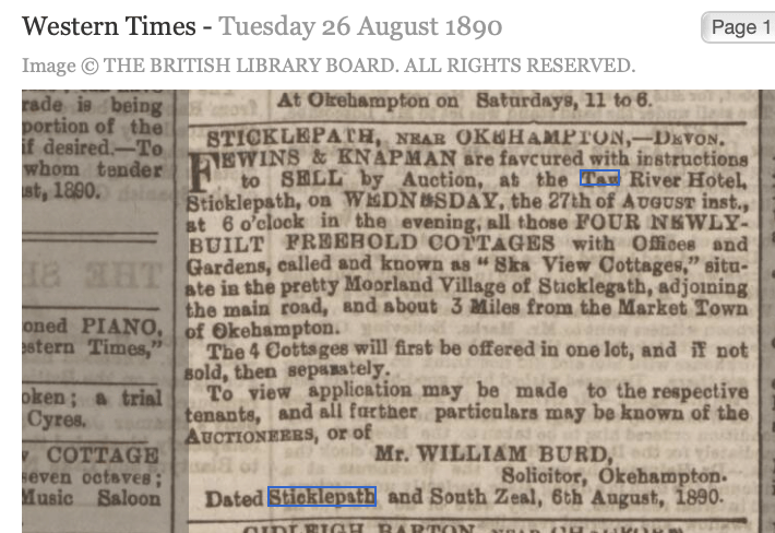 Three things have happened in this last week: while preparing for #OnePlacePubs I spotted an auction for the new Ska View cottages in Sticklepath (1890 advert image below); I heard a Zoom talk by Ivan Bunn at The Voice Cloud helpfully going through house deeds in some detail; and yesterday’s @househistoryhour with the amazing Steve Jackson @oneplacestudies – together these have spurred me on to consider the history of at least one house within that row of cottages.