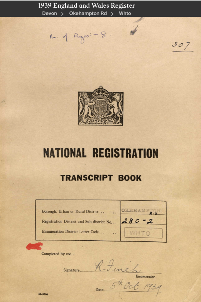 Sticklepath in 1939 was part of 3 Parishes, this focuses on the Sampford Courtenay enumerator district. The man in charge on 5th October was Ralph Finch (1891-1979).