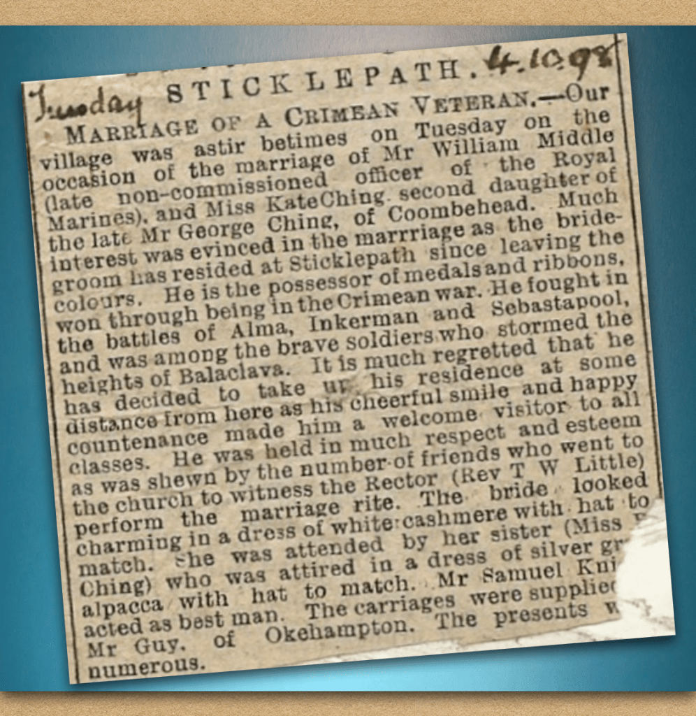 Anyhow being married gave me a bit more respectability, and of course I had to give up my position and come home closer to Sticklepath. Eliza was my bridesmaid and William had Samuel Knight as his best man. So many gifts, twas very useful. William had lived in lodgings and I was in service, so we needed most things for the kitchen and so on. We went to live down Exbourne, rented a little place t’other side of Okehampton to start off, but that didn’t last long.