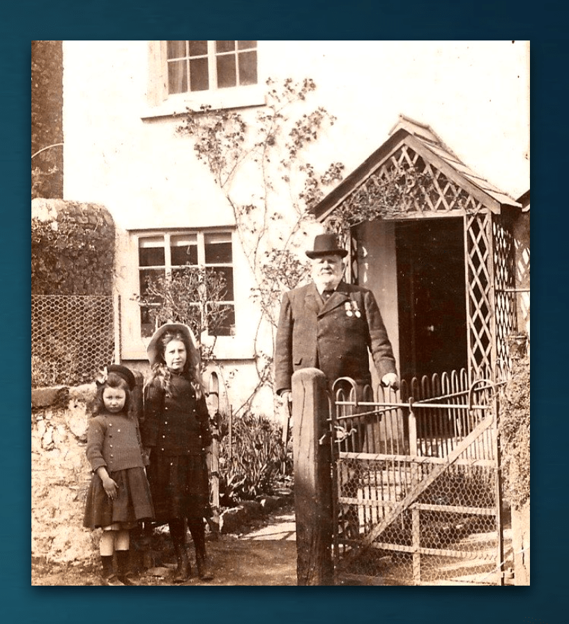 Yer be our house, Farley Cottage, jus’ opposite chapel. That’s William, with our nieces – Phyllis and Muriel. Uncle Middle and Auntie Kate they called us. Well I suppose, being of senior years, using his surname showed the proper respect. He would have been ‘Uncle’ before we married cos his first wife were a Finch, a relation of the girl’s father. I, of course, sister to their mother Gina.