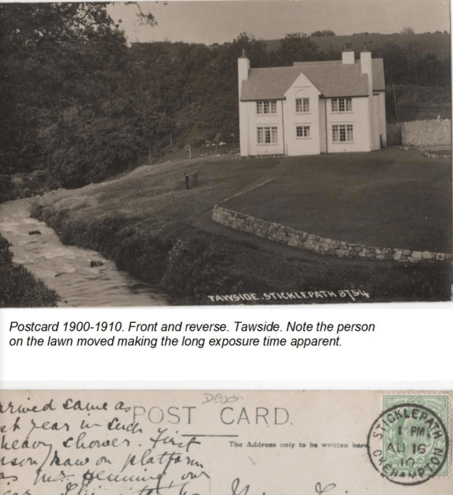 Just next to Sticklepath Bridge is Tawside, a striking house and setting. It has features of the ‘Arts and Crafts’ style and a coach house next to the lane.
