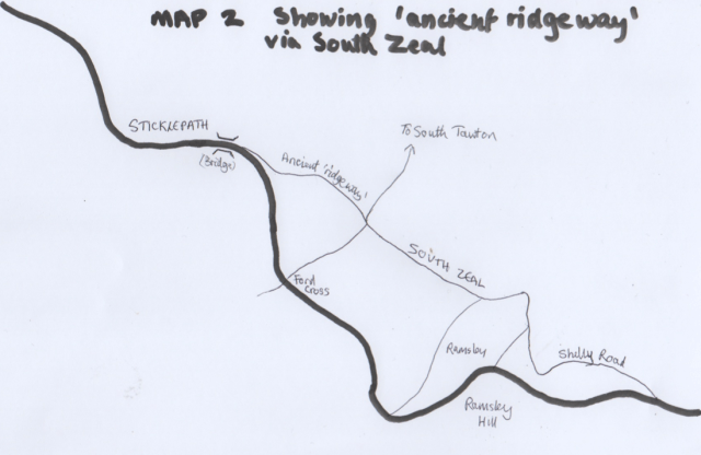 Travellers along the ancient ‘ridgeway’ would have passed through South Zeal, to rejoin our route just before Sticklepath Bridge. We follow the less steep road built 1830, down the hill past Ramsley mine with its spoil heap. Many of the workers here come from Sticklepath. We continue to Ford Cross.