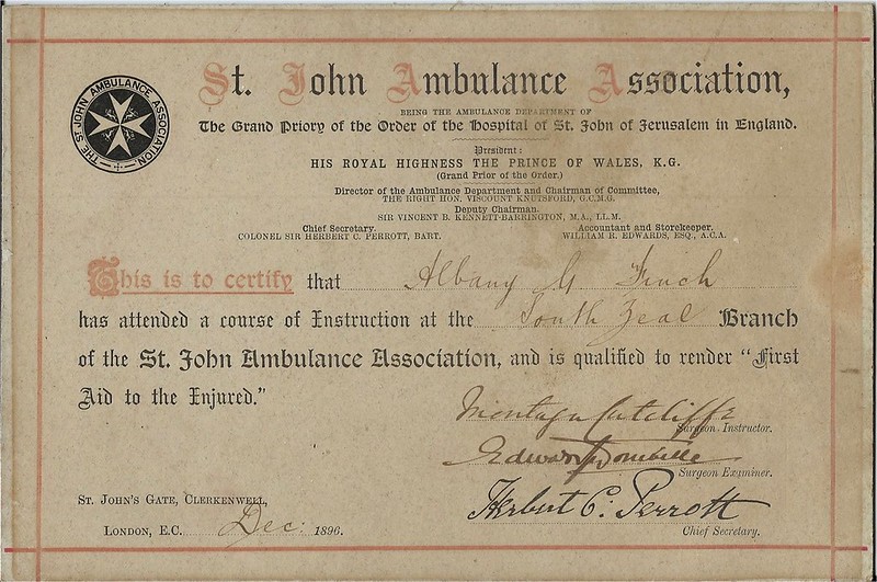 St John’s ambulance started their famous First Aid Courses with mining companies. As Sticklepath had several mines and quarries which would have taken part, so Albany Finch would likely have joined their workers, doing a first aid course to keep his Finch Foundry workers safe. They did, of course, supply specialist tools and other supplies to various mining and quarrying concerns. This is his certificate 1896: