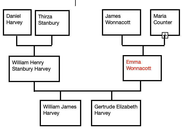 We first met Emma as the mother of Gertie Harvey. When Emma Wonnacott was born on 11 December 1869 in South Tawton, Devon, her father, James, was 38, and her mother, Maria, was 34. In 1871 James was a lime quarry labourer* and he and Maria had 3 other children at home with them in South Zeal – Ellen aged 14y, Joseph 12y, Anna Maria aged 4 as well as 1 year old Emma.