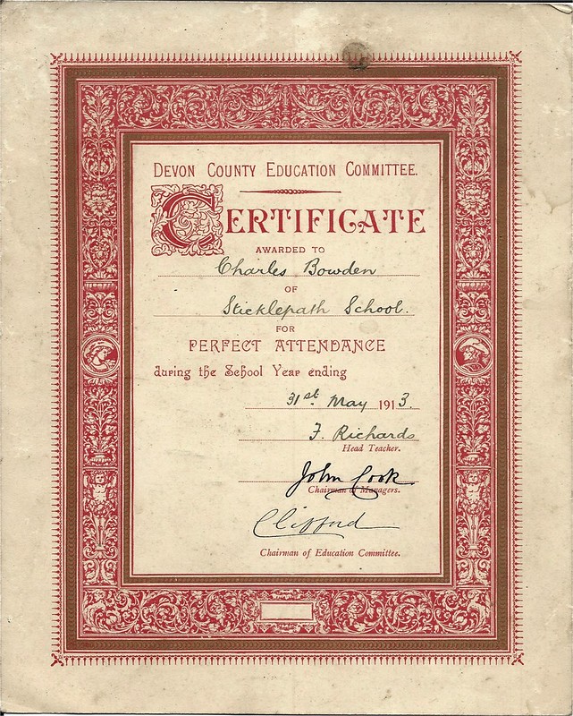 The Cooks were butchers and farmers. I think they lived in Tudor Cottage in Sticklepath and at some point this was a butcher’s shop. At another point I think they lived in Sunnyside. The marriage license for John Cook, butcher of Sticklepath and Mary Wills also of Sticklepath (dated 2 Aug 1836) is in South West Heritage Trust, Exeter archive. They were married in Sampford Courtenay church 17 October 1836, witnesses Agness Cook and Elizabeth Brooks Wills. The son, born 1840, who erected the window was a school governor (‘chairman of managers’) and gave children 1 shilling if they didn’t miss a day of school during the whole year. Charles Bowden achieved this. His (later) wife Muriel Finch spoke bitterly in 1989, aged 85y, of the fact she never did, as she was ‘a chesty little thing’ so had to miss school sometimes!