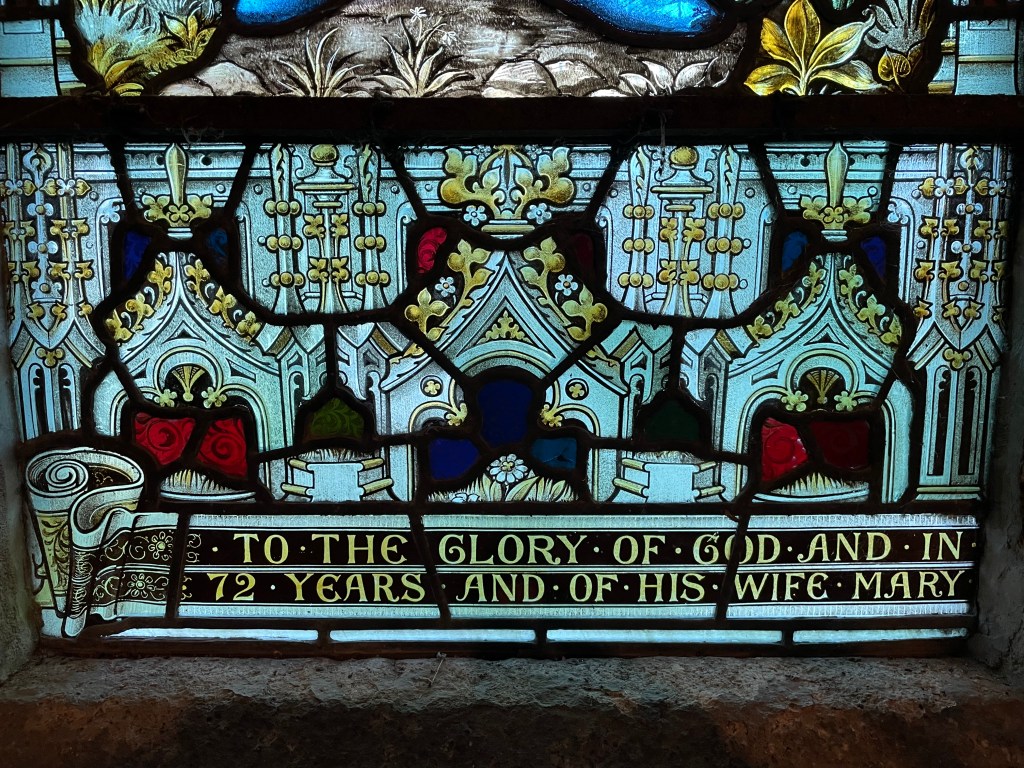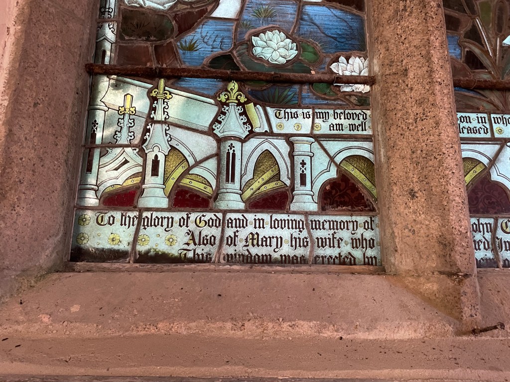 The west window was erected in 1913 by John Cook, depicting the baptism of Jesus. The inscription reads “To the Glory of God and in loving memory of John Cook who died Decr 2nd 1852 aged 46 years. Also of Mary his wife who died June 21 1882 aged 82 years. This window was erected by their only son John Cook 1913”. They are all buried in the (ecumenical) Quaker Burying Ground.