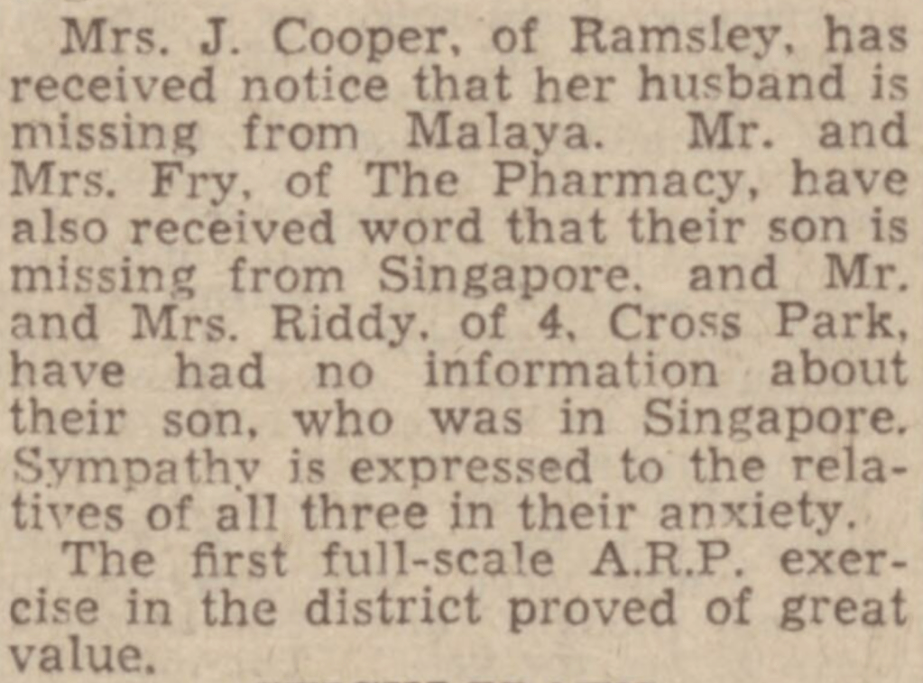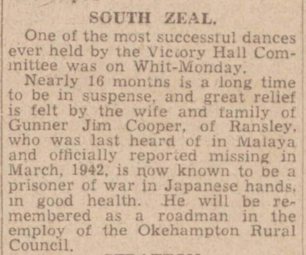I like to think her husband Jim took this little postcard or its twin with him in his breast pocket when he went to war. But then he went missing. It is a story of 16 months heartache, Gladys not knowing where her husband was. The newspaper takes up the story. (All articles held by The British Library, accessed via Britishnewspaperarchive.co.uk February 2021). The Western Times on Friday 27 March 1942 tells us: